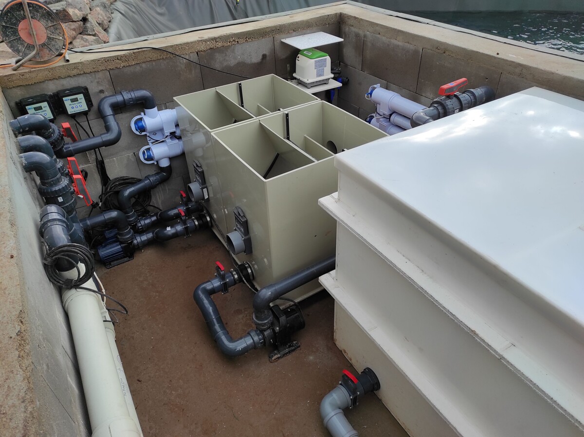 Čerpadlová instalace filtrace s šachtou – voda protéká skimmerem, gulou a potrubím do rozvodné šachty s regulačními šoupaty a čerpadlem. Z šachty je tlačena potrubím přes UV lampy do filtru. Z filtru poté samovolně vytéká do jezírka nebo potoka.
